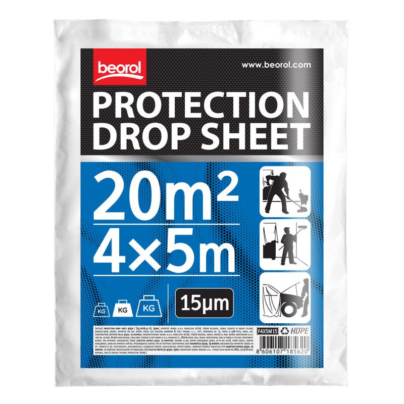 Zaštitna folija 4x5m, 15 mikrona idealna je za prekrivanje nameštaja, podova i drugih površina tokom molerskih, renovacionih i građevinskih radova. Napravljena od HDPE materijala, folija je lagana, fleksibilna i jednostavna za postavljanje, a istovremeno dovoljno čvrsta da pruži adekvatnu zaštitu.